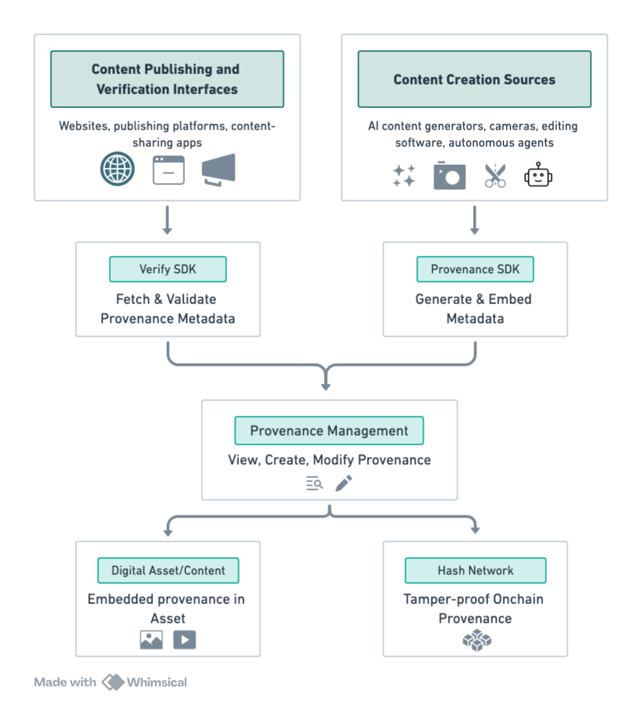 Built on **C2PA standards**, the SDK ensures cross-platform compatibility while leveraging Hash Network's blockchain infrastructure for immutable and scalable provenance storage. It supports the lifecycle of content, from creation to modification, ensuring trust and transparency.